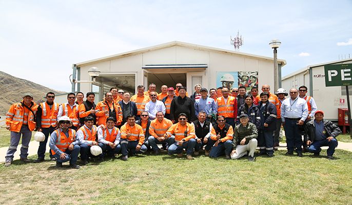 Guo Wenqing with employees at the Bambas Copper Mine's campsite