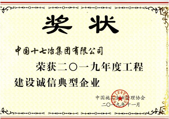 12月9日,中国十七冶集团收到中国施工企业管理协会颁发的荣誉证书,公司“工程建设AAA信用等级”复审通过,并被授予“2019年度工程建设诚信典型企业”荣誉称号。