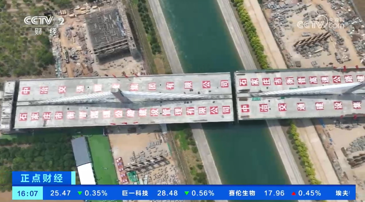 央视财经频道CCTV2《正点财经》5月27日播出中冶交通衡昔高速项目重大工程节点《河北赞皇:国内首座跨南水北调干渠矮塔斜拉特大桥成功转体》,展现中冶交通项目团队攻克大吨位、大角度转体等技术难题,完成我国首座跨越南水北调干渠矮塔斜拉转体桥,实现“华丽转身”完成合龙。
