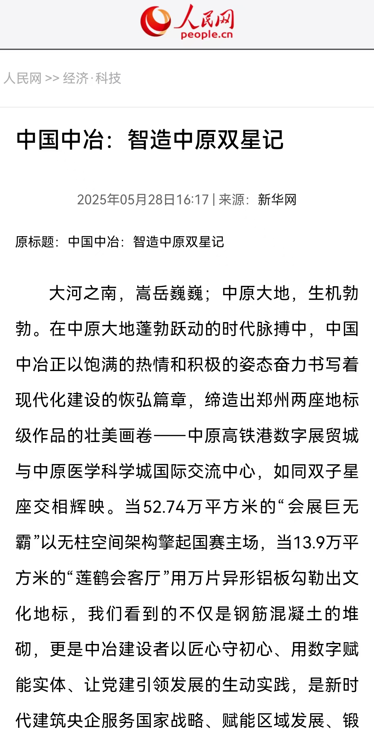 人民网5月28日以《中国中冶:智造中原双星记》为题报道,中国中冶正以饱满的热情和积极的姿态奋力书写着现代化建设的恢弘篇章,缔造出郑州两座地标级作品的壮美画卷——中原高铁港数字展贸城与中原医学科学城国际交流中心,如同双子星座交相辉映。