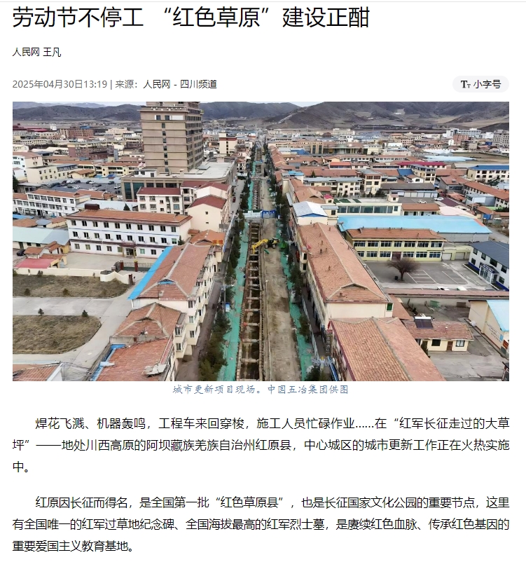 人民网近日以《劳动节不停工 “红色草原”建设正酣》为题报道,中国五冶红原县城市更新改造建设项目所在地平均海拔3500米,正处于施工“黄金期”,团队和500名工友劳动节假期不松劲、不减速,继续抓好施工统筹、资源调配保障,确保工程早日惠及民生,赋能城市发展。
