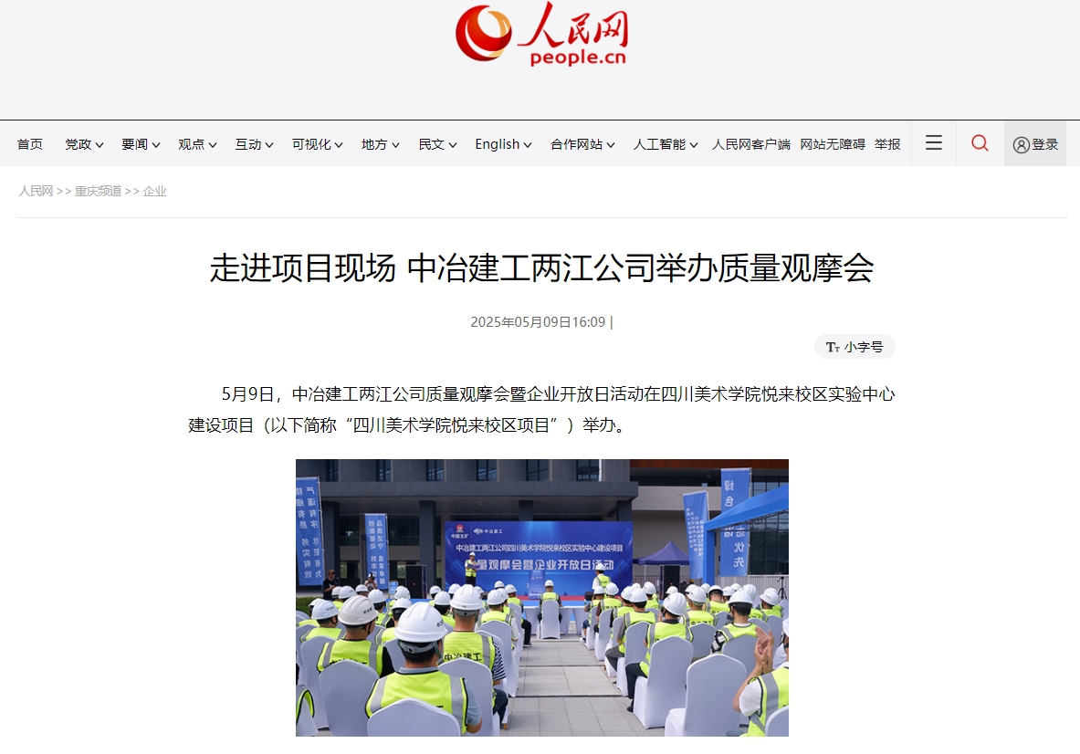 人民网5月9日以《走进项目现场 中冶建工两江公司举办质量观摩会》为题报道,本次观摩现场采用“现场讲解+实体展示”的形式,共设置了党建引领、企业文化、工艺实体样板打造等10个观摩点,布置展板100余块,重点展现项目在质量管理、新工艺、强制做法等方面的工作亮点和成效。