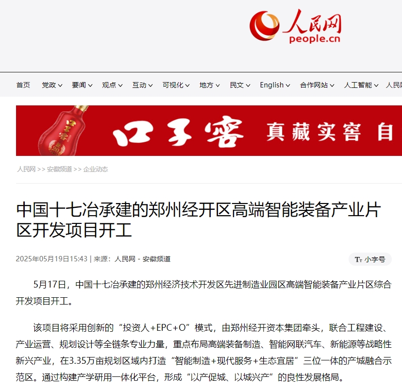 人民网5月19日以《中国十七冶承建的郑州经开区高端智能装备产业片区开发项目开工》为题报道,中国十七冶承建的郑州经济技术开发区先进制造业园区高端智能装备产业片区综合开发项目开工,在3.35万亩规划区域内打造“智能制造+现代服务+生态宜居”三位一体的产城融合示范区,通过构建产学研用一体化平台,形成“以产促城、以城兴产”的良性发展格局。
