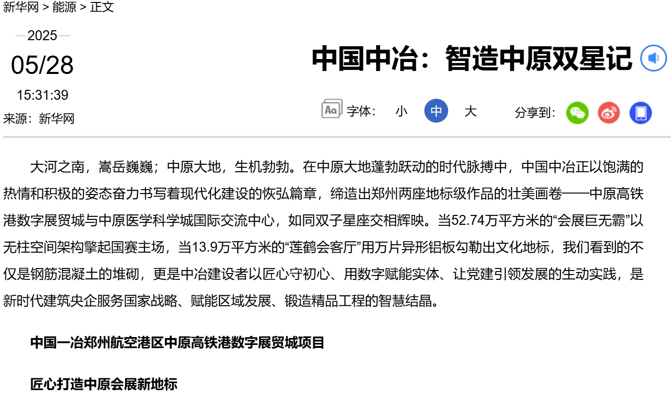 新华网5月28日以《中国中冶:智造中原双星记》为题报道,郑州两座地标级建筑——中原高铁港数字展贸城与中原医学科学城国际交流中心,如同双子星座交相辉映,这是中冶建设者以匠心守初心、用数字赋能实体、让党建引领发展的生动实践,是新时代建筑央企服务国家战略、赋能区域发展、锻造精品工程的智慧结晶。