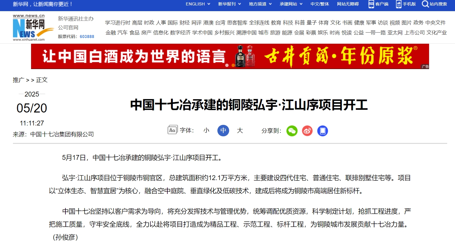 新华网5月20日以《中国十七冶承建的铜陵弘宇·江山序项目开工》为题报道,中国十七冶承建的弘宇·江山序项目开工,总建筑面积约12.1万平方米,主要建设四代住宅、普通住宅、联排别墅住宅等。项目以“立体生态、智慧宜居”为核心,融合空中庭院、垂直绿化及低碳技术,建成后将成为铜陵市高端居住新标杆。